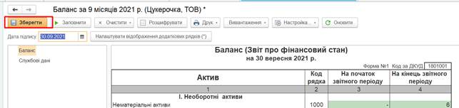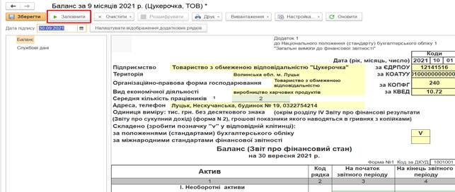 показаний не заповнений бланк ф. 1 Баланс. Після натискання на кнопку Заповнити автоматично формуються