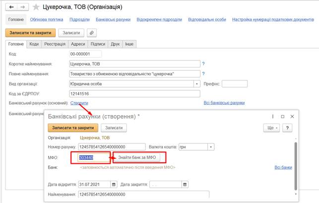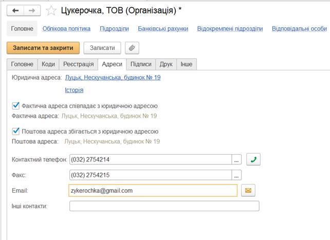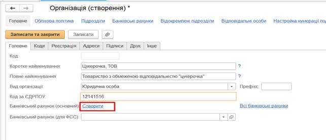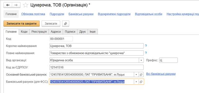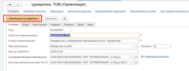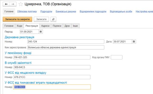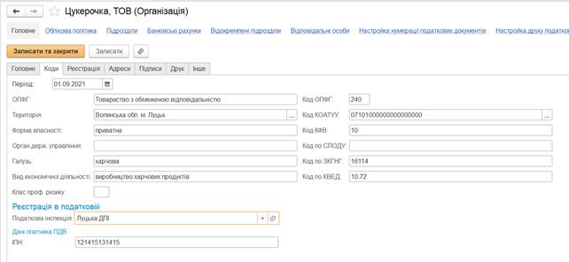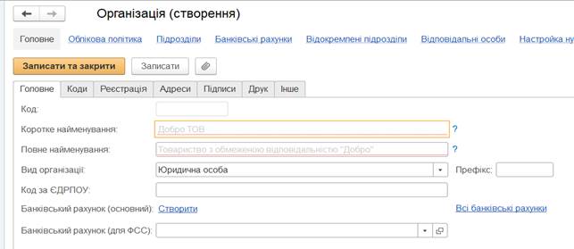 необхідно заповнити дані про коди організації, її реєстрацію та адреси,