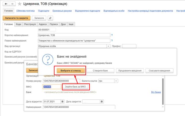 Довідник Організації. Введення даних про підприємство