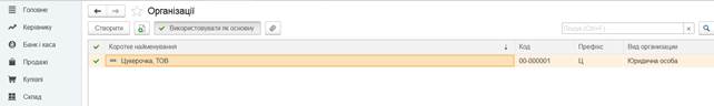 Вибираємо команду головного меню Головне - Організації. Відкриється