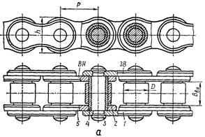 Роликовий ланцюг (рис. 2, а) складається з ланок двох типів: