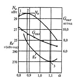 Рис. 6.1 – Регулювальна характектеристика бензинового двигуна за складом суміші