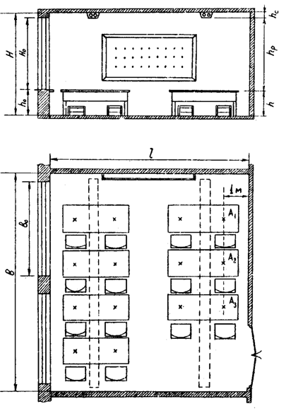 приміщення з експлікацією точок виміру освітлюваностей і розташуванням джерел