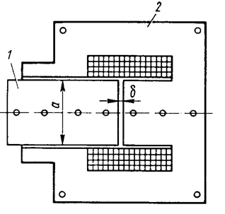 Рис. 4.4. Ескіз клапанного П-подібного електромагніту змінного струму: 1 – якір, 2 –