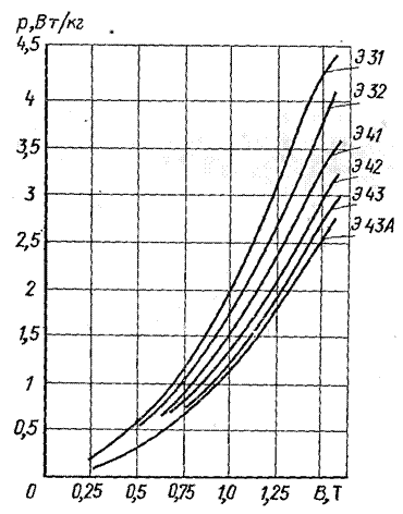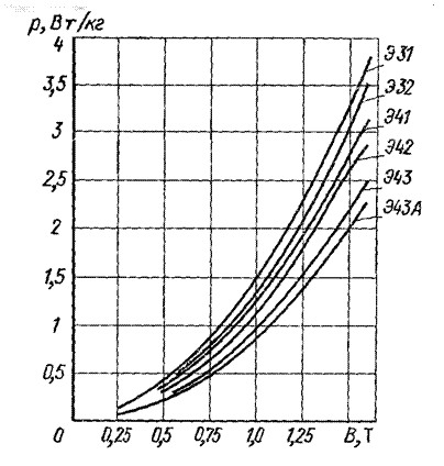 Залежність питомих теплових втрат від магнітної індукції для гарячекатаних трансформаторних сталей з товщиною – та