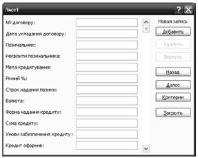 8. У вікні «Форма» вивести інформацію про роботу відділу кредитування філії № 1 КБ «Банкірчик» (рис. 1.8).