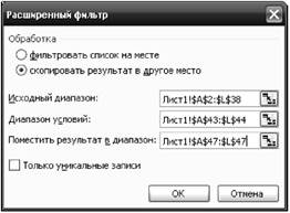 - якщо відібрані записи необхідно помісити в інше місце, то в полі Помістити результат в діапазон вказати відповідний діапазон комірок для відібраних даних (розмір вказаного діапазону повинен бути таким же, як і розмір вихідної бази даних);