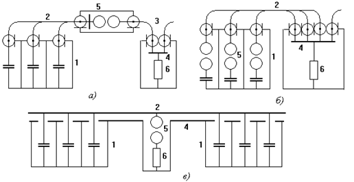 – те ж, але з розрядником на кожен конденсатор блоку; в – накопичувач із