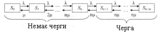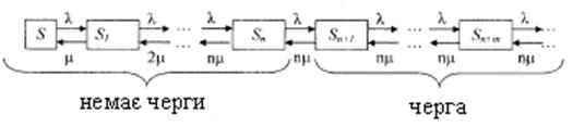 стає в чергу і чекає обслуговування. Розмічений граф станів представлений на