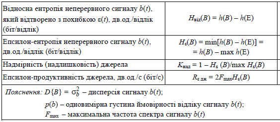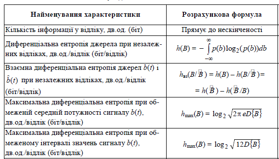 Таблиця 6.1 - Розрахункові формули інформаційних характеристик неперервного