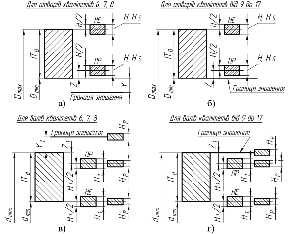 Схеми полів допусків калібрів наведені на рис.1.4.