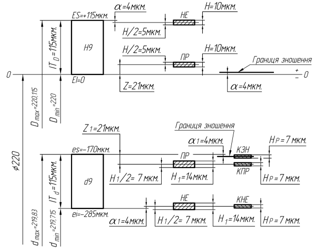 розміри робочих калібрів для контролю деталей з’єднання (табл.1.2) та