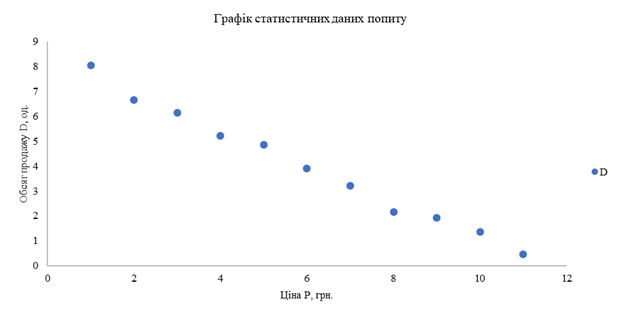 Побудувати графік статистичних даних попиту (поле кореляції) у такій