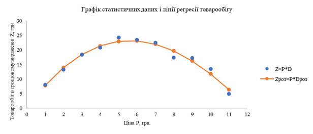 Рис. 2.5. Графік статистичних даних і лінії регресії товарообігу.