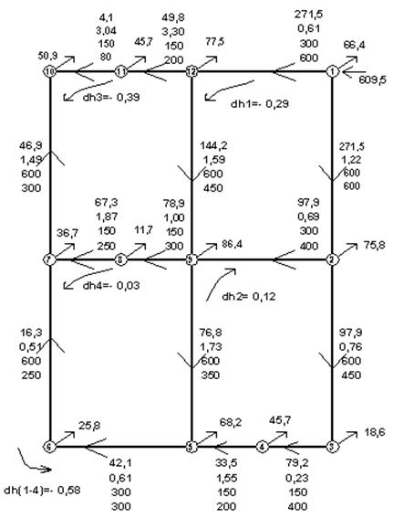 На розрахунковій схемі мережі (рис. 4.1) нумеруються розрахункові ділянки та кільця. На розрахункових ділянках проставляються прийняті для них витрати та відповідні діаметри. Дані заносяться у таблицю, у якій визначаються неув’язки втрат напору для кожного кільця.