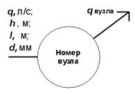 1. Розрахункова схема мережі. Реальна схема мережі з великою кількістю точок відбору води споживачами замінюється розрахунковою схемою мережі (рис. 4.1) з вузловими точками відбору води – вузлами.