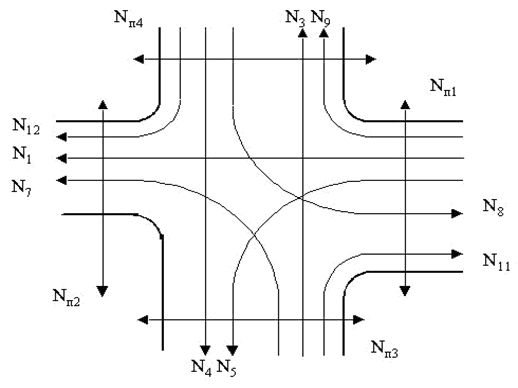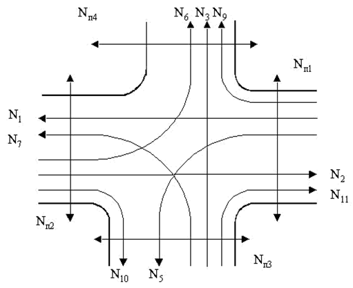 Інтенсивність транспортних потоків на перехресті, авт/год