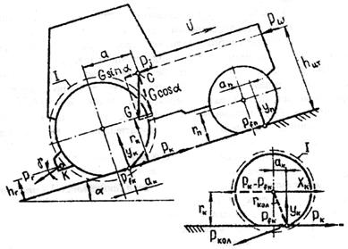 1. Сили, що діють на колісний трактор або автомобіль.Розглянемо загальний випадок руху машини (трактора, автомобіля) на підйом по верхні, розміщеній під кутом