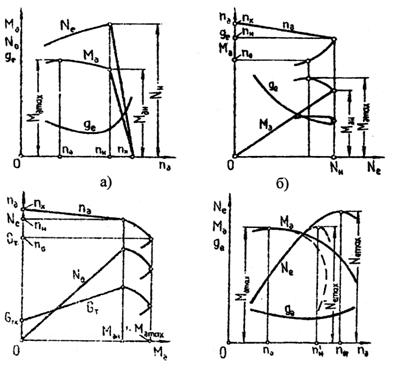 Рис.42. Регуляторна характеристика дизельного двигуна у функції від частоти обертання колінчастого вала (а), ефективної потужності (б), крутного моменту (в). |