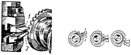 Два стругальних різці 1 і 2 здійснюють прямолінійні зворотнопоступальні рухи вздовж зубів оброблюваної