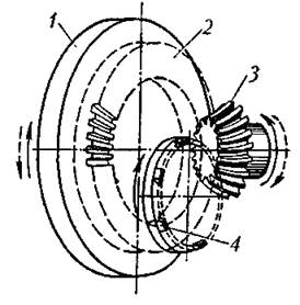 по дузі кола різцевою головкою. На планшайбі зуборізного верстата 1 встановлюється обертова різцева головка 4, що відтворює криволінійний зуб уявлюваного плоского спірально-конічного колеса. Заготовка зубчастого