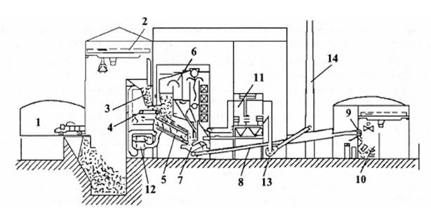 обладнання з вентиляторами для подачі повітря; 13 – димосос; 14 – димар