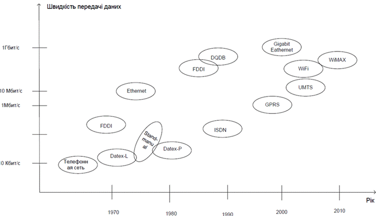 обмінюватися інформацією зі швидкостями, що варіюються від 64 кбіт/с до