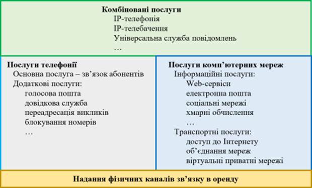 дві великі групи послуг: послуги телефонії і послуги комп’ютерних мереж.