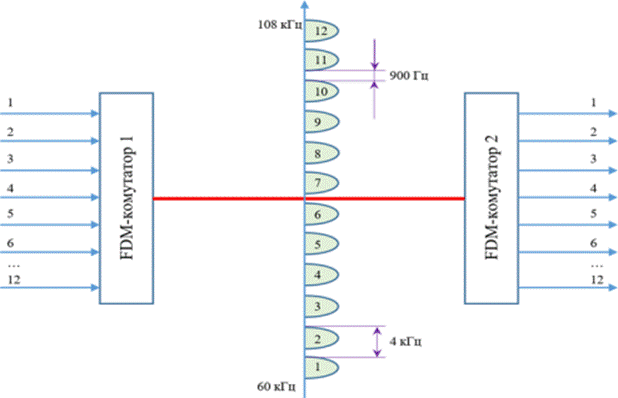 FDM-комутаторами одночасно передаються сигнали всіх абонентських каналів, але кожен з них займає свою смугу
