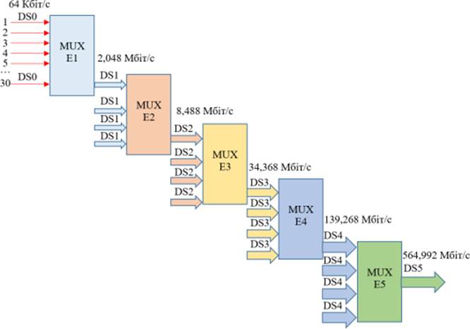Наступні рівні ієрархії утворюються мультиплексуванням чотирьох потоків попереднього рівня (рис. 26). Таким чином, швидкість передачі на наступних рівнях становить 8 Мбіт/с, 34 Мбіт/с і 140 Мбіт/с, 565 Мбіт/с. На більш високих рівнях агрегація потоків відбувається побітно, а не побайтно, як на першому рівні (табл. 1).