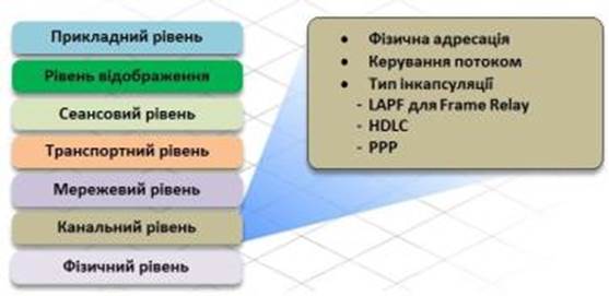 адресація, управління потоками і тип інкапсуляції, а також порядок проходження даних по каналу мережі WAN. Тип застосовуваної технології WAN визначає використовувані стандарти канального рівня (рис. 43).
