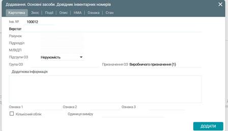 відкривається з головного меню ОЗ та НМА – Інвентаризація ОЗ – Основні засоби