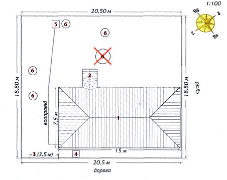 план: 1.Будинок; 2.Ґанок; 3.Ворота; 4.Вигрібна яма; 5.Колодязь із водоміром;