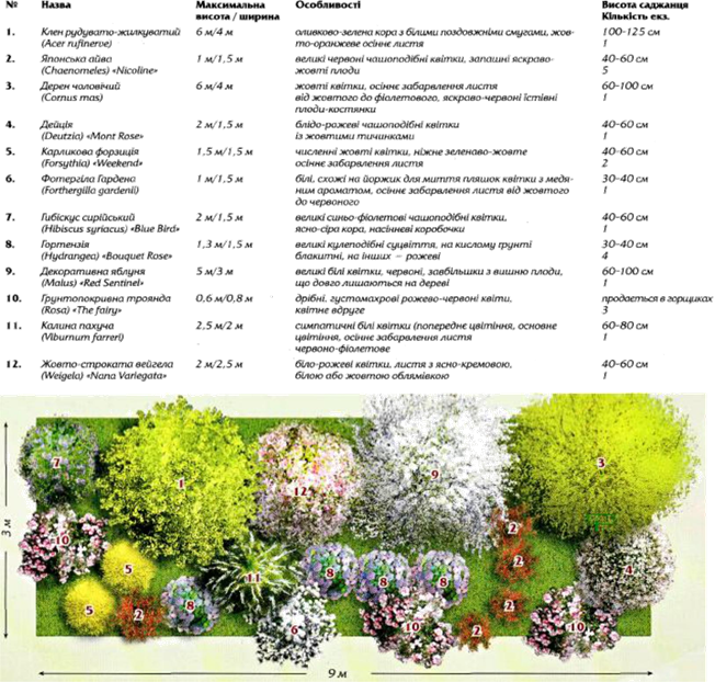 щось на кшталт відомості: укажіть породу дерев і кущів, їхні приблизні розміри.