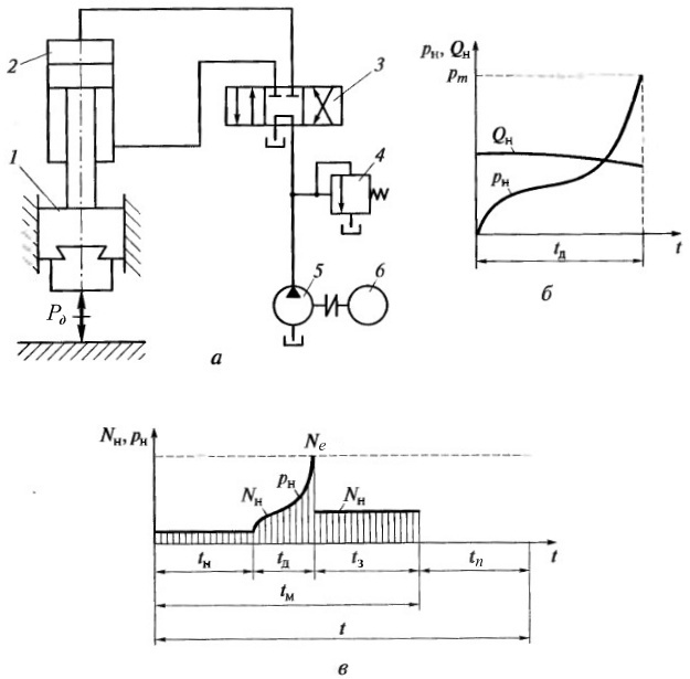 тиску та подачі насосу під час робочого ходу tд; в – діаграма потужності