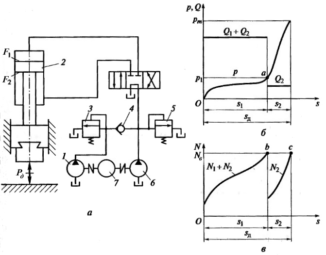 тиску та подачі насосу; в – діаграма потужності приводу під час робочого ходу sд. 1 – насос низького тиску; 2 – робочий циліндр; 3 – розвантажувально-запобіжний клапан