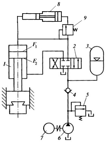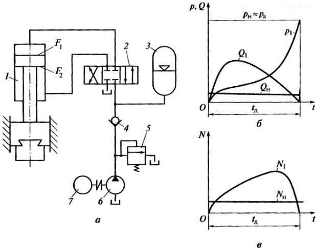 Рис. 10.4 – Принцип дії насосно-акумуляторного гідроприводу.