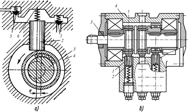 – плунжери; 3 – нерухома вісь; 4 – клапани; 5 – ролики; 6 – рухомий