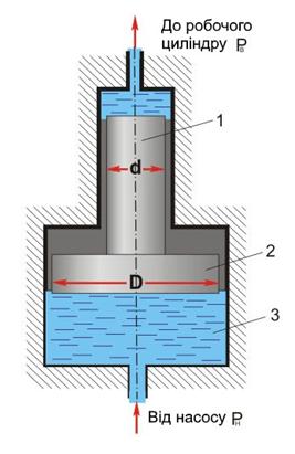 1 – плунжер малого діаметру; 2 – поршень великого