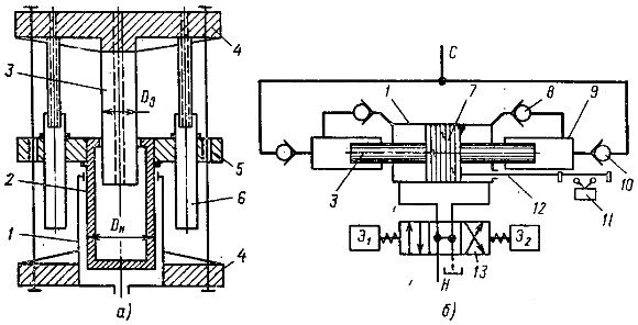 , сигнал до яких поступає від кінцевого перемикача 11, який керується штангою 12 з штовхачами. При русі поршня 1 вправо нагнітається рідина з циліндра 9 через зворотній клапан 10 в напірну магістраль С, а при русі правого плунжера вліво