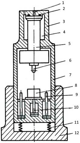 пуансон, 7 – рама молота, 8 – матриця, 9 – гідроциліндри, 10 – виштовхувач, 11 – амортизатори, 12 – станина.