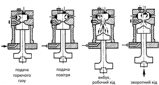 послідовність роботи вибухового молоту з використанням горючих сумішей. Молот