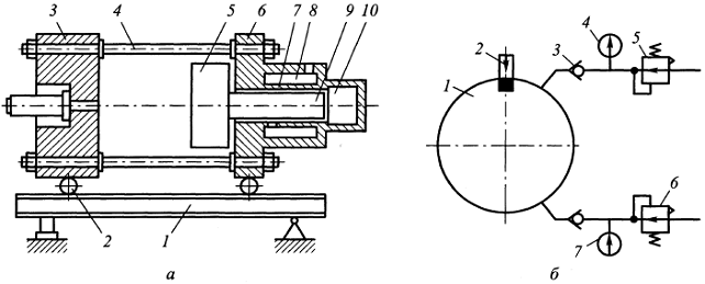 ущільнення, 3 – робочий циліндр, 4 – камера для газу, 5 – шток-поршень, 6 –