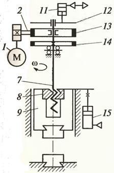 постійно (як в кривошипних пресах). При вмиканні механізму 11 він з'єднується фрикційною муфтою 12 з веденим диском та допоміжним маховиком 14, який скріплений з гвинтом 7.