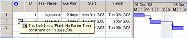 Відразу після цього в полі «Індикатори» (Indicators) відображається спеціальний значок, вказуючий на наявність у завдання обмеження. При підведенні покажчика мишки до такого значка, з'являється пояснення «Це завдання має обмеження Закінчити Не Пізніше»