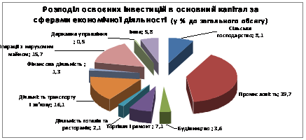 Провідними сферами за обсягами залучення інвестицій в основний капітал залишаються: промисловість – 52,9 млрд. грн., операції з нерухомим майном, оренда, інжиніринг та надання послуг підприємцям – 20,9 млрд. грн., діяльність транспорту і зв’язку – 21,5 млрд. грн.